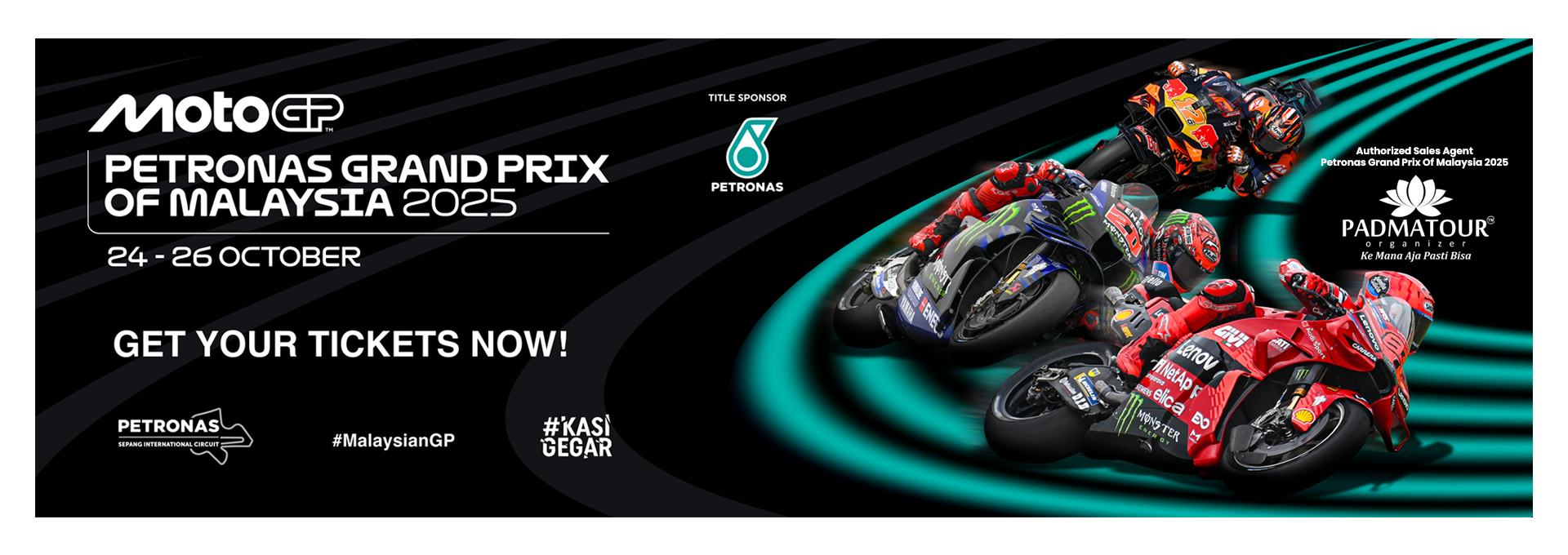 Bersiaplah untuk MotoGP Sepang 2025! Padmatour Organizer dengan bangga mengumumkan bahwa kami resmi ditunjuk sebagai Authorized Sales Agent untuk Petronas Grand Prix of Malaysia 2025. Inilah kesempatan Anda untuk menyaksikan langsung aksi MotoGP kelas dunia di Sepang International Circuit! Dapatkan tiket Anda sekarang — mulai dari Regular, Grandstand, hingga VIP — dan rasakan sendiri kemeriahan akhir pekan balap paling seru.